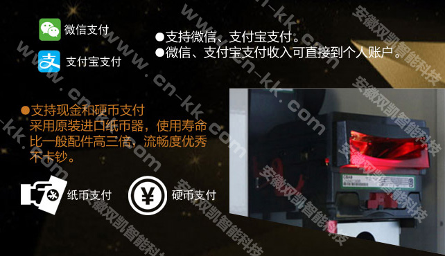 支付方式方面,安徽雙凱的智能系統完美匹配移動支付方式,支持支付寶、微信付款功能。另外可以根據客戶需求增加現金支付以方便各類消費人群。采用原裝進口紙幣器,使用壽命比一般配件高三倍,流暢不卡鈔。